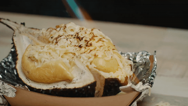 榴蓮能凍,當然也能烤。喜歡吃熱食的榴蓮食客還發明瞭“烤榴蓮”,一種充分激發榴蓮的香氣和甜味的吃法。