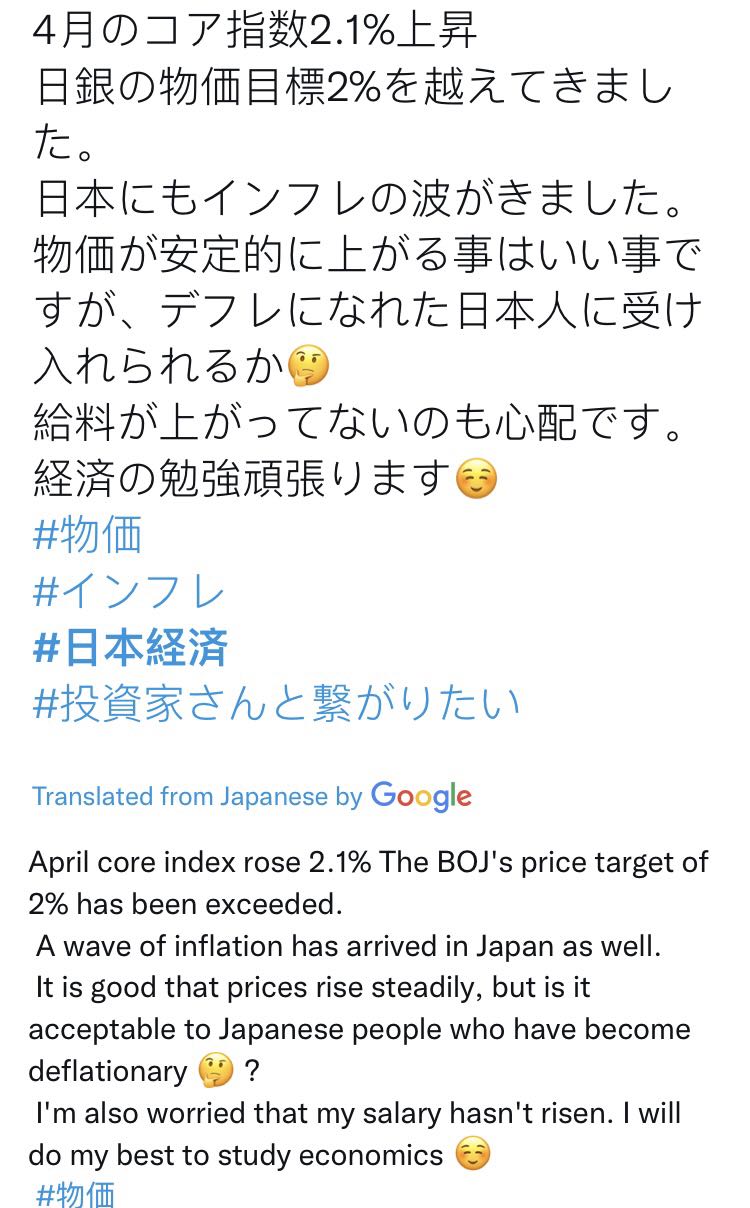 “新一波通脹也來到了日本,雖然物價逐步上漲是好事,但是對於日本人民來説,通貨緊縮是可以接受的嗎?”