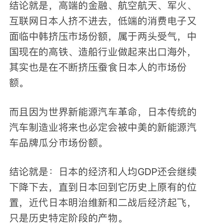“結論就是:日本的經濟和人均GDP還會繼續下降下去,直到日本會到它歷史上原有的位置,近代日本明治維新和二戰後經濟起飛,只是歷史特定階段的產物。”