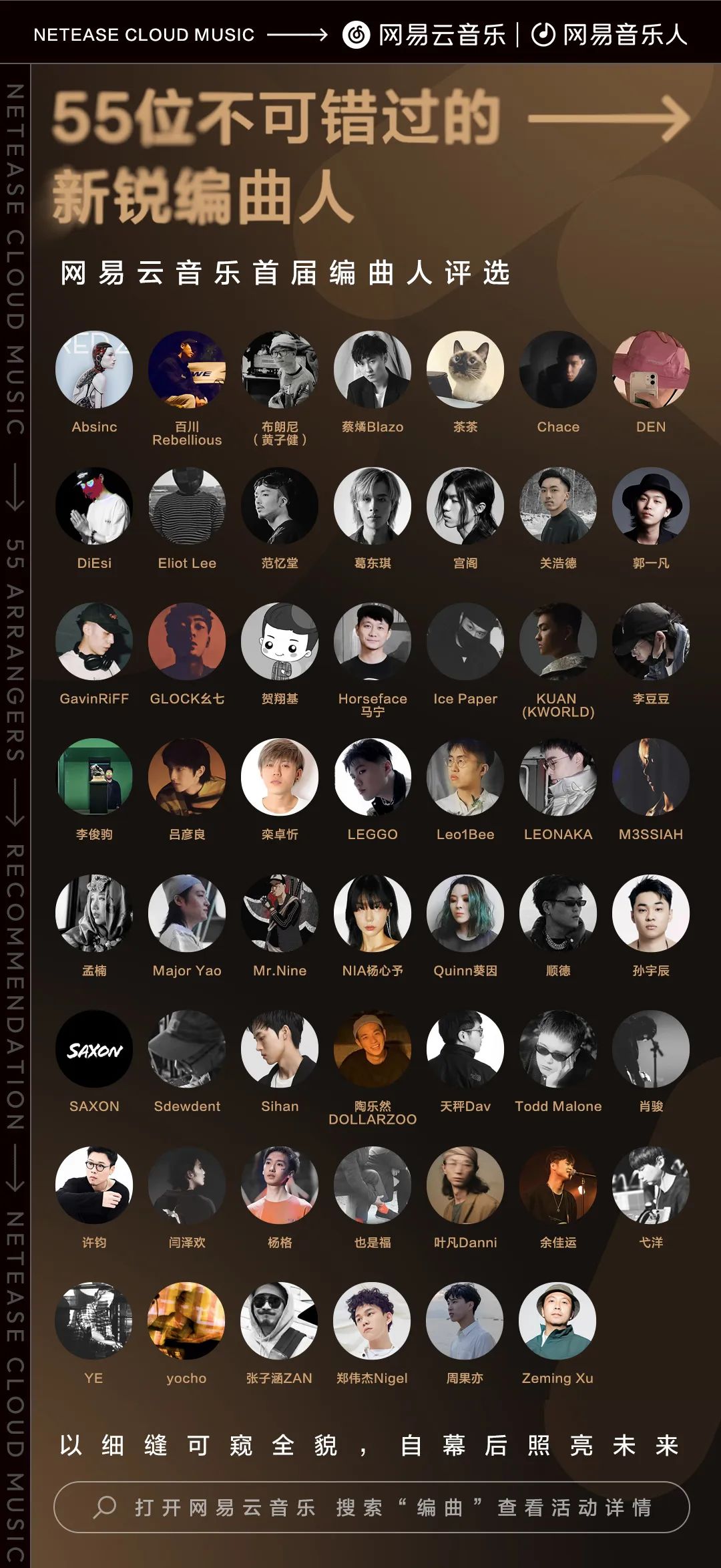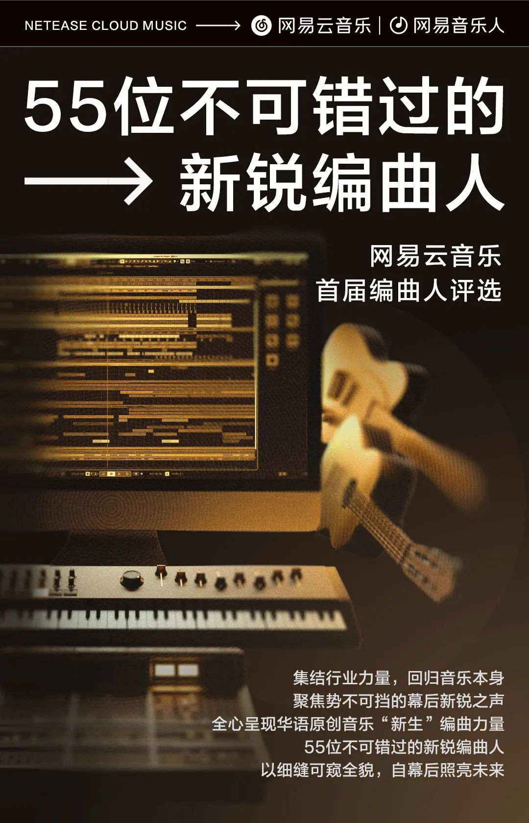 這個榜單其實來自網易雲音樂策劃的“首屆編曲人評選”活動。從今年1月起,活動就面向全行業開始了評選招募,共收穫了近萬首參賽作品,兩千餘位華語新生代編曲人蔘與了報名評選。歷時五個月的時間,活動評選出了來自華語樂壇不同風格的55位編曲人。