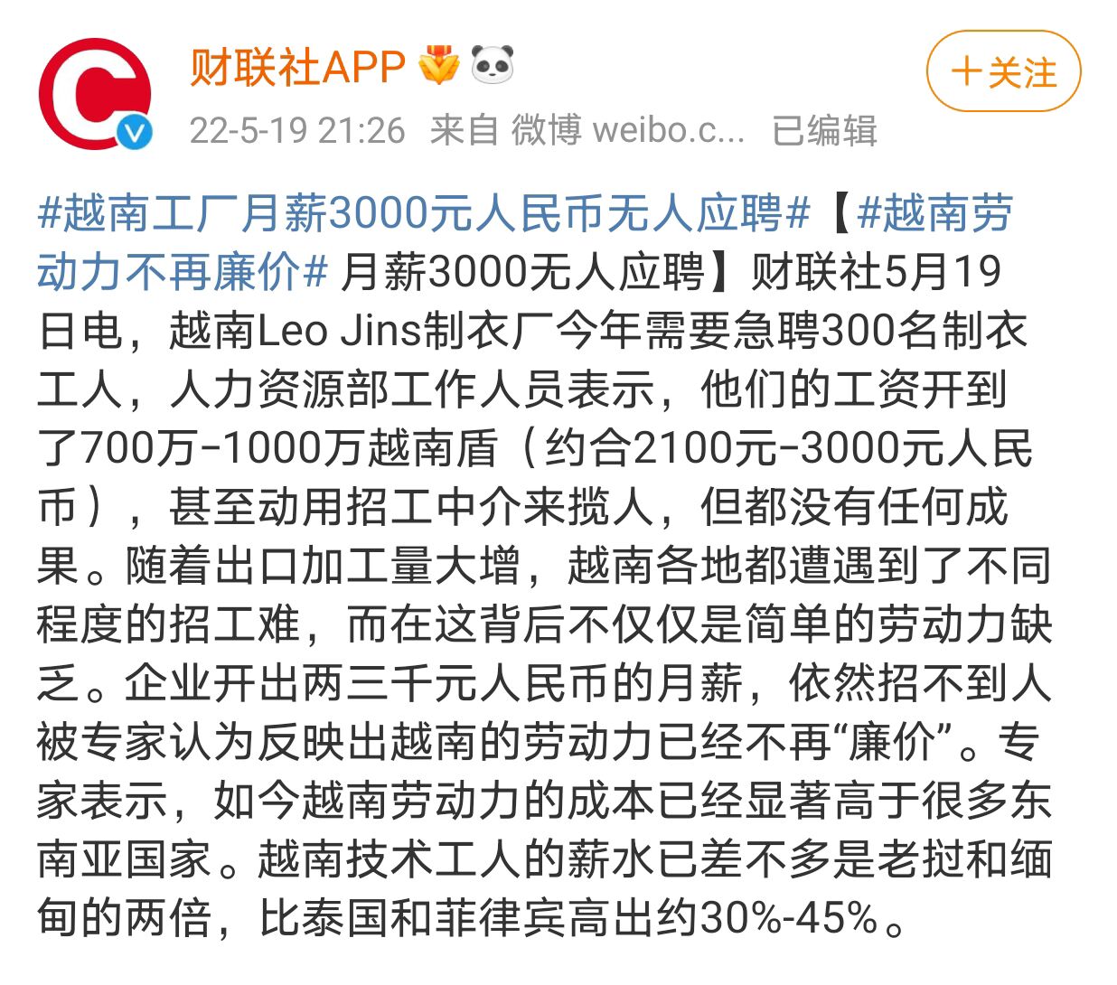 相關段落,大家有興趣可以去看看原文:《越南工廠的難題:勞動力不再“廉價”,月薪3000無人應聘》