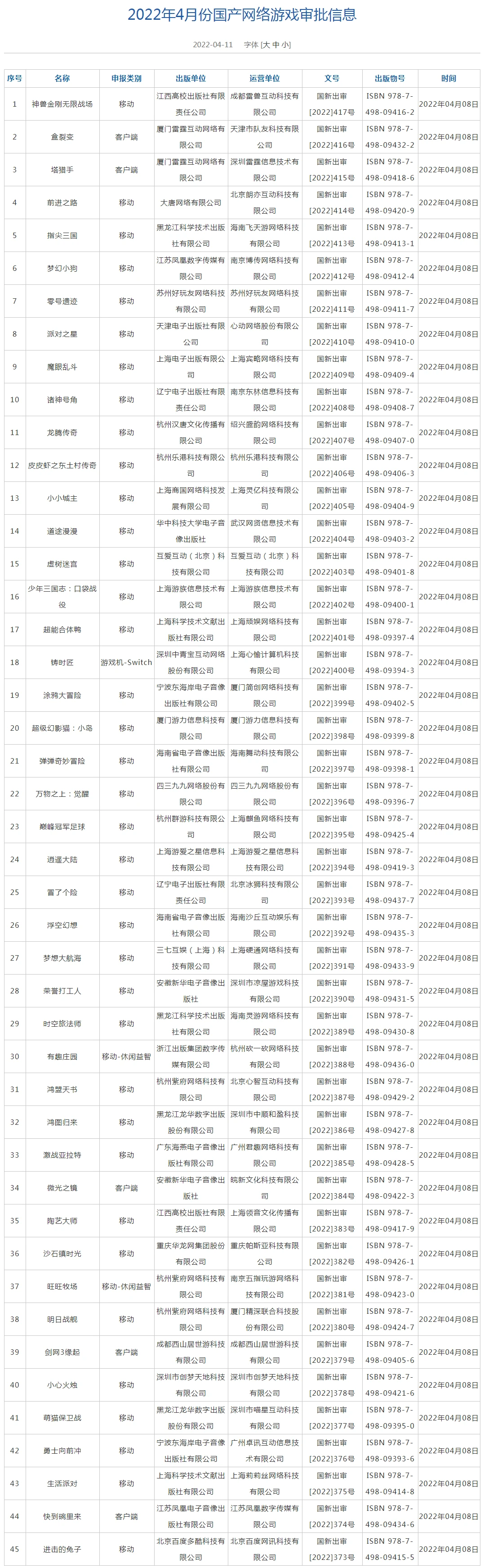 2022 年 4 月第一批遊戲版號發佈名單(上下滑動查看更多)