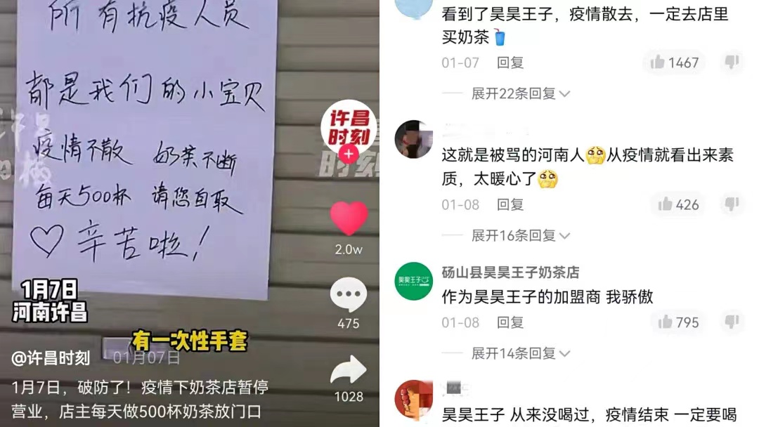 許昌“昊昊王子”奶茶店,疫情期間每天做500杯奶茶供抗疫人員自取,很多網友評論:“這樣的奶茶店,必須讓它火”,“等疫情散去,一定要去喝一杯他家的奶茶”。