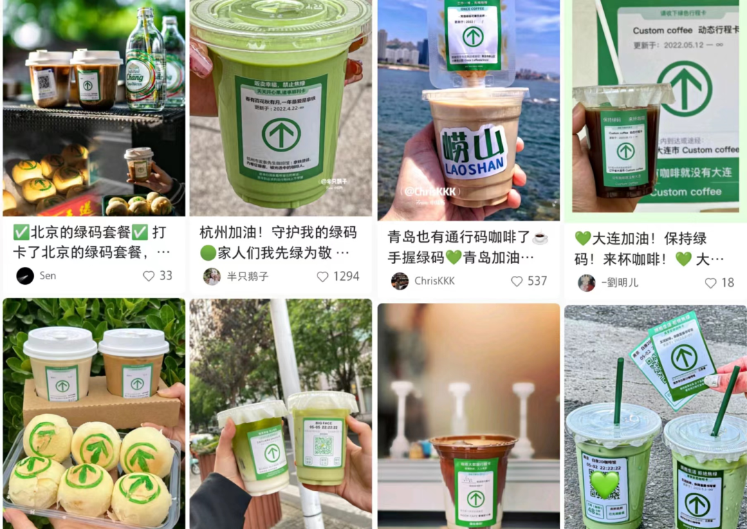 咖啡館們巧妙地將人們日常使用到的“健康碼”字樣,貼到了咖啡杯上,寓意**“喝咖啡之餘,也要保住綠碼”。**