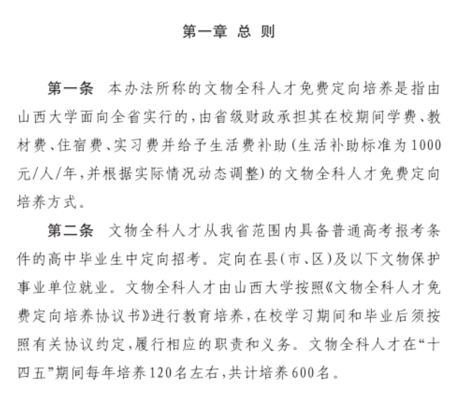 辦法中的相關條例,詳情見:《山西省文物局等5部門關於印發文物全科人才免費定向培養實施辦法的通知》