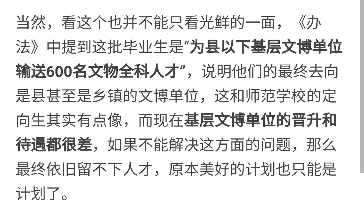 而除去對學校的教研團隊要求高以外,方法中提到相關人才畢業後要去的地方是縣(市、區)及以下基層文博單位就職,這些地方的待遇能不能留住他們也是一個很大的問題。