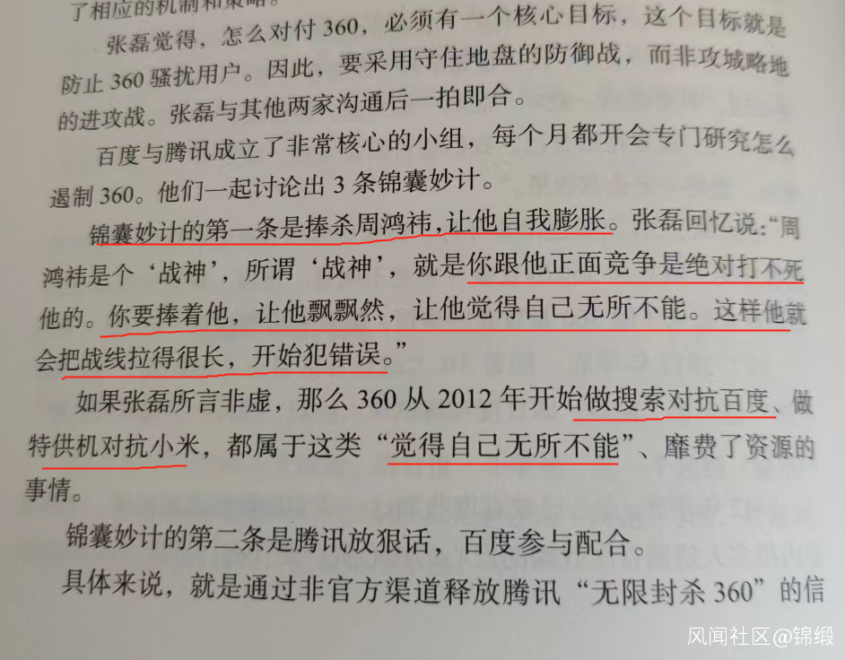 如書中所述,周鴻禕從2012年開始四面出擊,做搜索戰百度、做手機對抗小米。也不知是老周本人的戰略失誤還是對手的“錦囊妙計”起了作用,多線作戰極大的消耗了周鴻禕的精力和公司資源,為360後來一系列的麻煩埋下了伏筆。