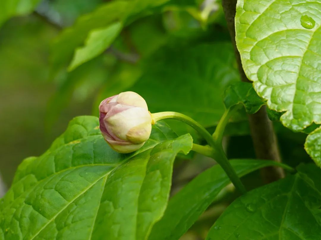 蒼翠欲滴的綠葉泛着夏日的陽光,一盞盞白裏透紅的花兒從碩大的對生葉之間探出,外側的白是淡抹的粉,邊緣點綴濃妝的紫,如山茶般靜謐,似玉蘭般清純,若蓮花般空遠。細看那明黃色的內輪裹着杏黃色的花葯,露出蕊的芬芳。