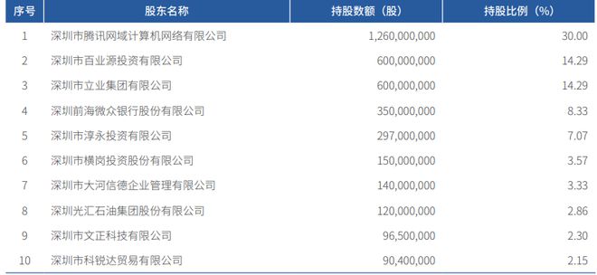 披露信息顯示,微眾銀行的第一大股東為深州市騰訊網域計算機網絡有限公司,持股比例為30%。其次,深圳市立業集團和深圳市百業源投資有限公司各持股14.29%。目前,顧敏任微眾銀行的董事長兼首席執行官,李南青任黨委書記兼行長。