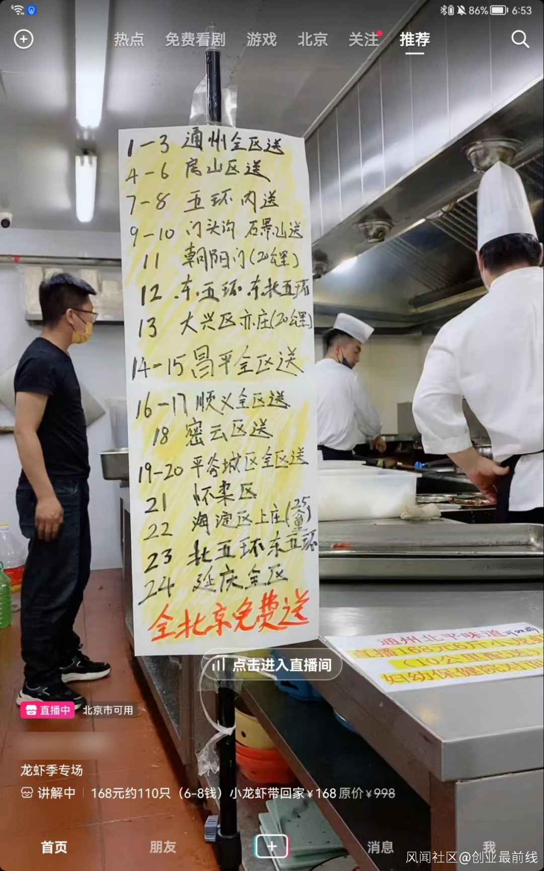 在眾多餐飲店擺攤兒、做預製菜生意的同時,也有很多餐飲企業在各大直播平台開通了賬號,努力推動食品外送生意,甚至連一些酒店的餐廳也擠入了這股“直播浪潮”。