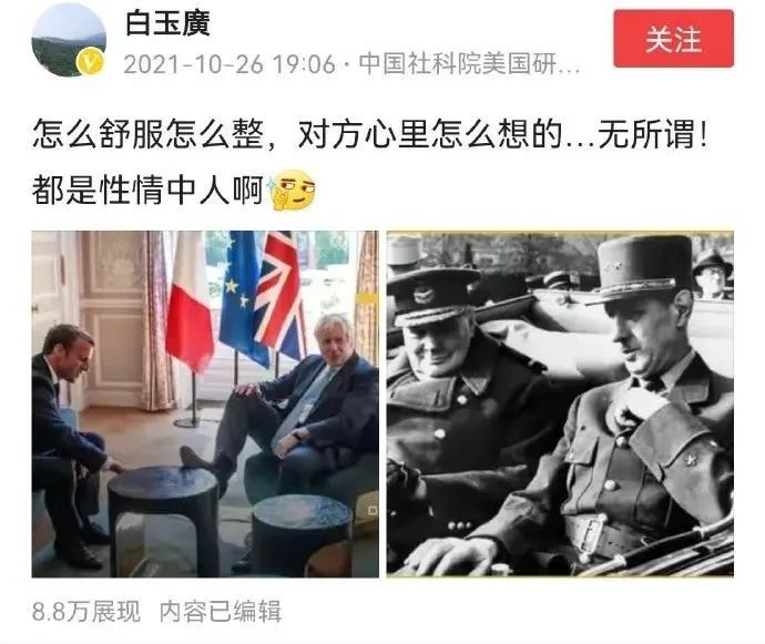 最搞笑的,為了舔美西,居然把英國首相約翰遜會見法國總統馬克龍時用腳蹬茶几的嚴重有失外交禮儀的行為歌頌為“性情中人”。