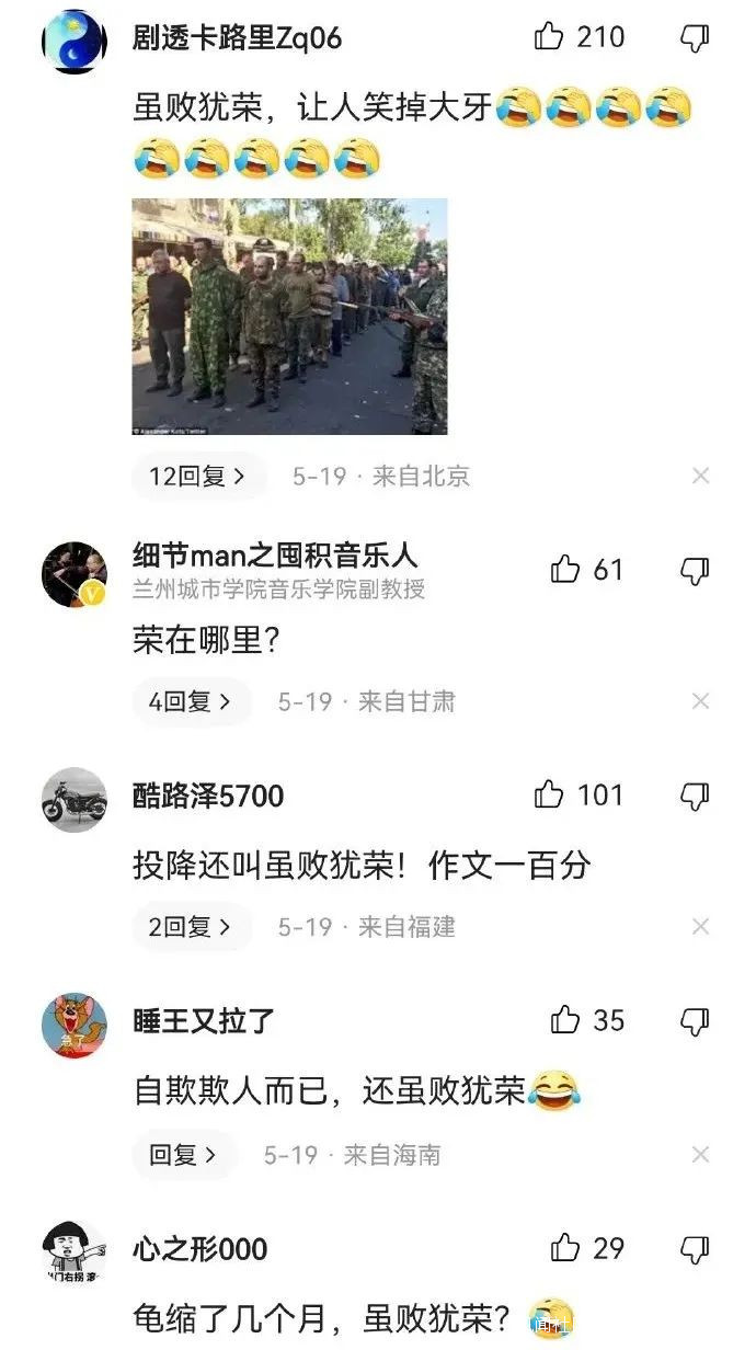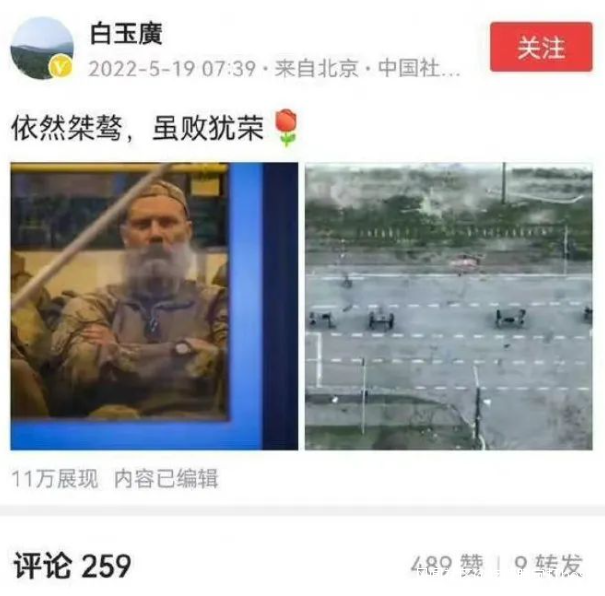 這個“中國社科院美國研究所助理人員”在昨天早上7時39分在頭條上發帖,對於被困於亞速鋼鐵廠地堡內的納粹武裝組織“亞速營”向俄軍的投降,稱之為“依然桀驁,雖敗猶榮”。