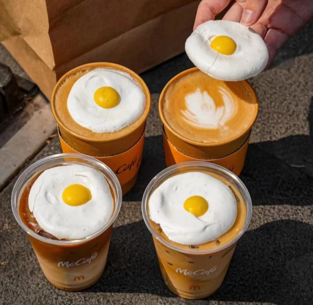 另一種是隻取形似,比如益禾堂的番茄蛋湯,實際是以綠茶為底,加入鳳梨和聖女果製造“番茄蛋湯”的錯覺。麥當勞的荷包蛋咖啡,則是由蛋白霜支撐,承擔造型作用。