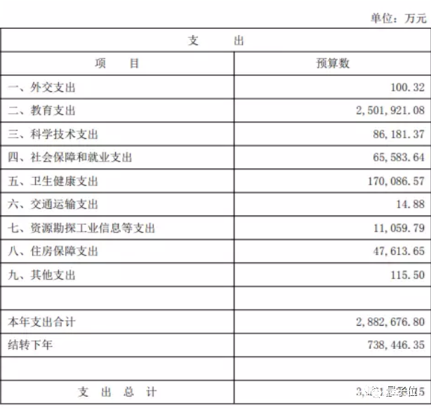 還是這張表,我們聚焦支出部分,可以看見一共分為九大項,最大的為教育支出,足足250億,佔到全部支出的快70%,且相比去年增加了約40億元。