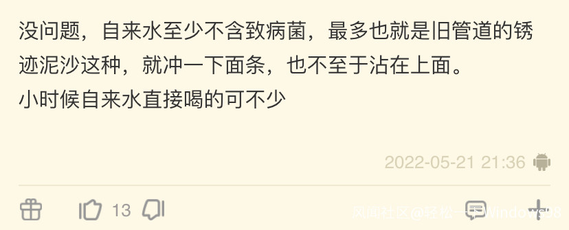也有人説,自來水不含病菌,最多是舊管道里的鏽跡泥沙等,就衝一下麪條也不至於粘在上面。