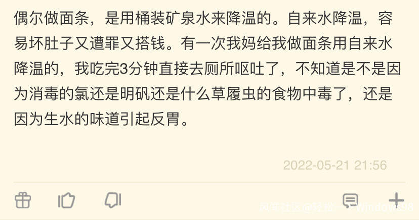 但也看到有人談到自己的經歷,説是用自來水給麪條降温,吃完3分鐘就去廁所嘔吐了。