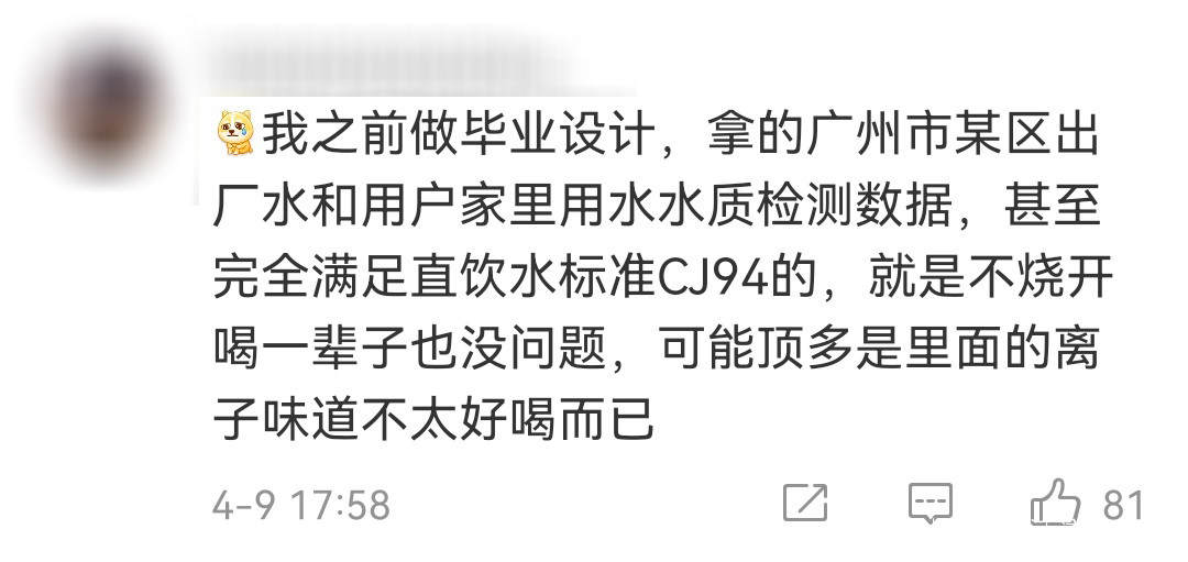 有網友自稱是做水質檢測的。他表示,泵房出去的水24小時都有人檢,管道也會常常沖洗……自來水被稱為“生活飲用水”是有國標的,一百多項指標都合格才能出廠。
