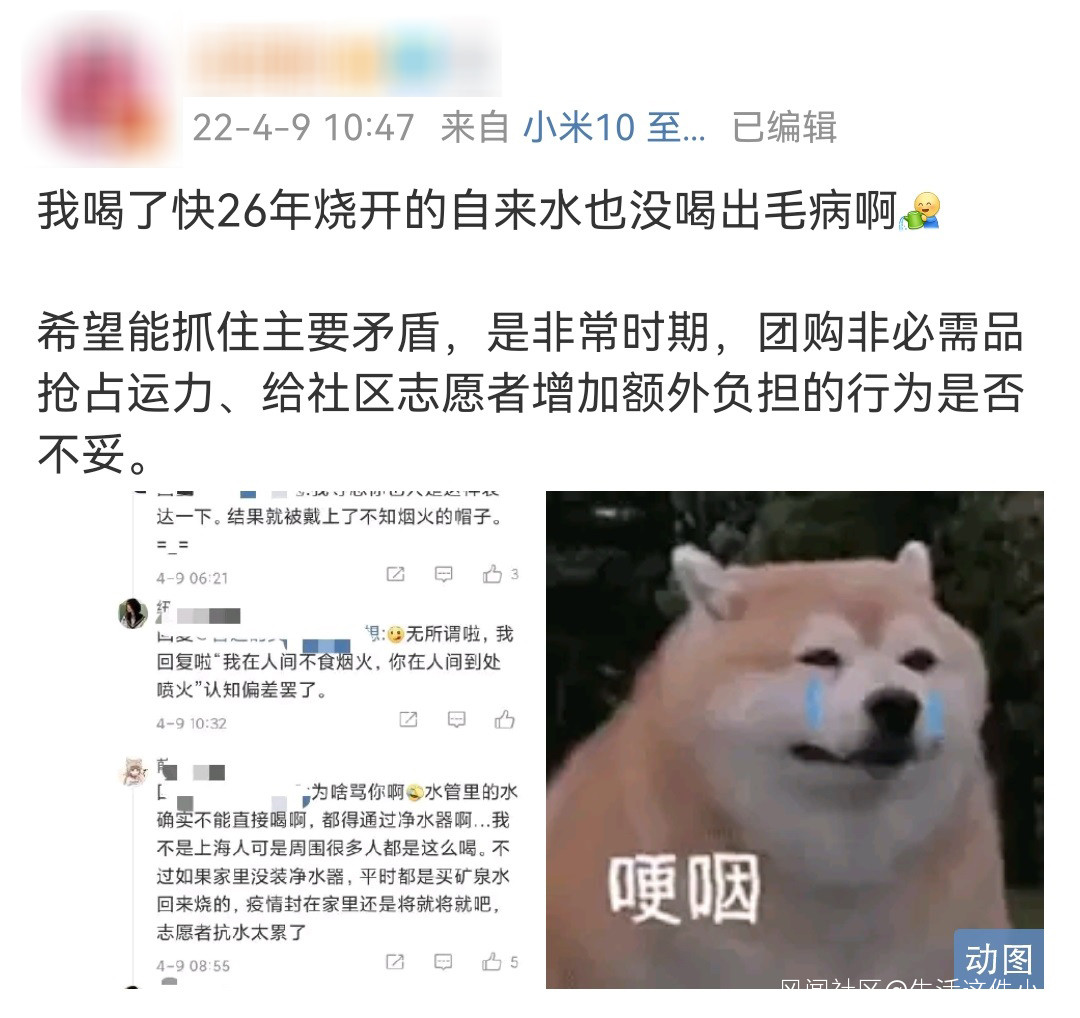 有網友發文稱,自己活了那麼多年,一直都是接的自來水,然後燒開了喝。非常時期,非常應對,希望大家都能抓住主要矛盾,不再團購非必需品,避免擠佔運力,也避免給社區志願者增加額外的負擔。