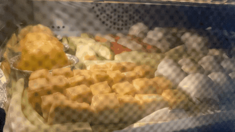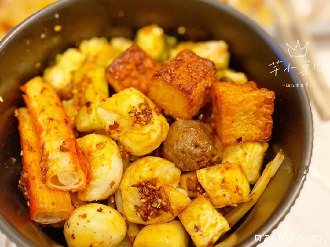 期中烤的托盤們取出來檢查下成熟度,蝦滑熟了、豆腐更乾燥了、魚豆腐變大了、蟹棒變胖了,芝心魚丸變酥了、葫蘆瓜變軟了,墨魚仔變….變得快消失了。