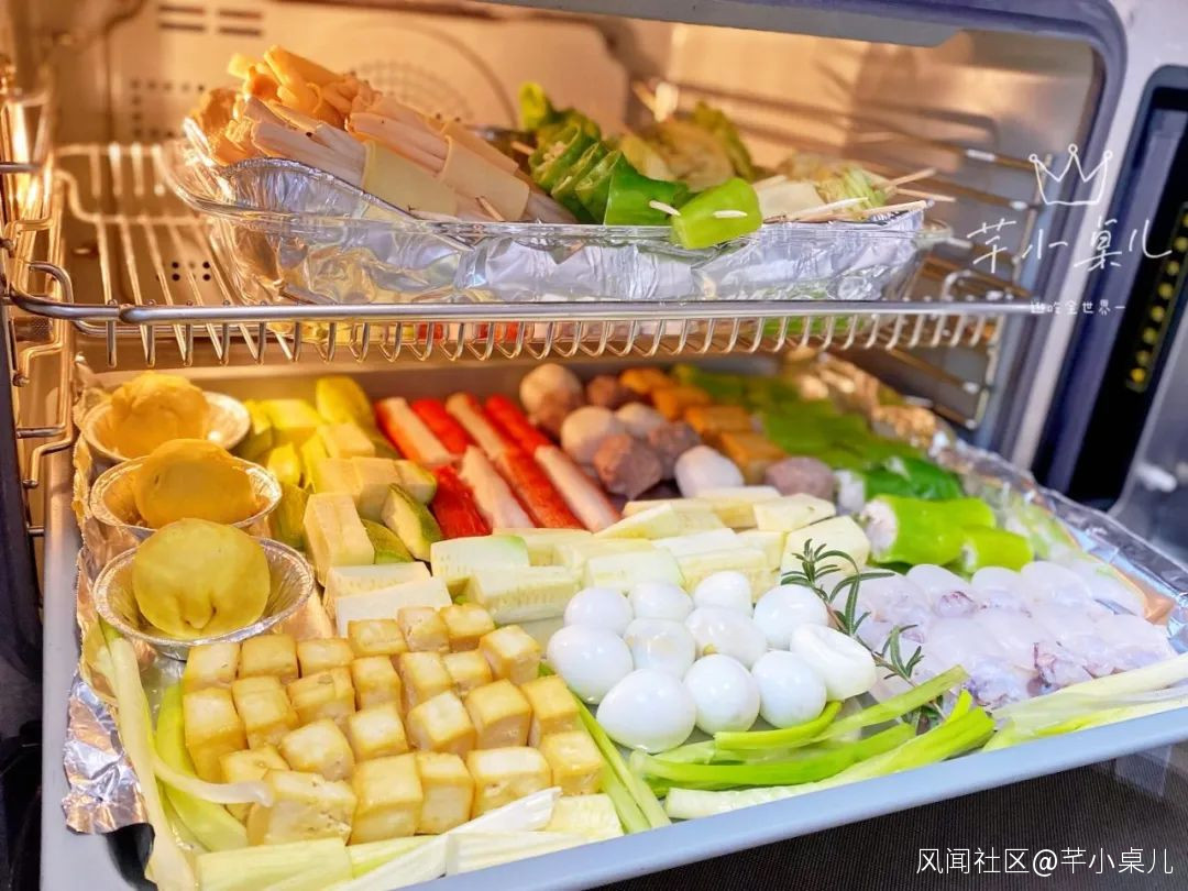 因為至少我串的這些蔬菜在烤制中會大量出水,出的水可以從孔洞漏到托盤裏,不至於浸泡在蔬菜上變成水煮菜,畢竟,烤火鍋,咱們還是要保證點煙熏火燎的焦糊味兒。