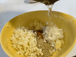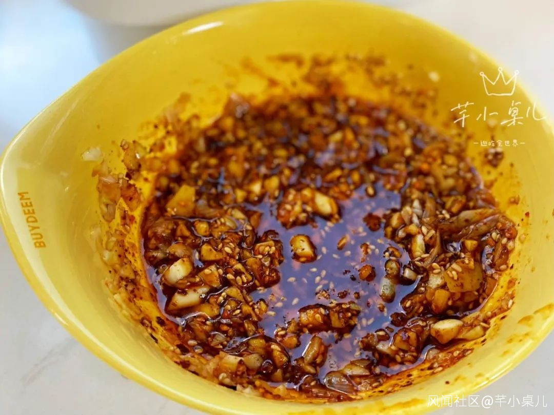 蒜末+葱花+薑末+醋辣子面+細辣子面+鹽+雞精+白胡椒+白芝麻