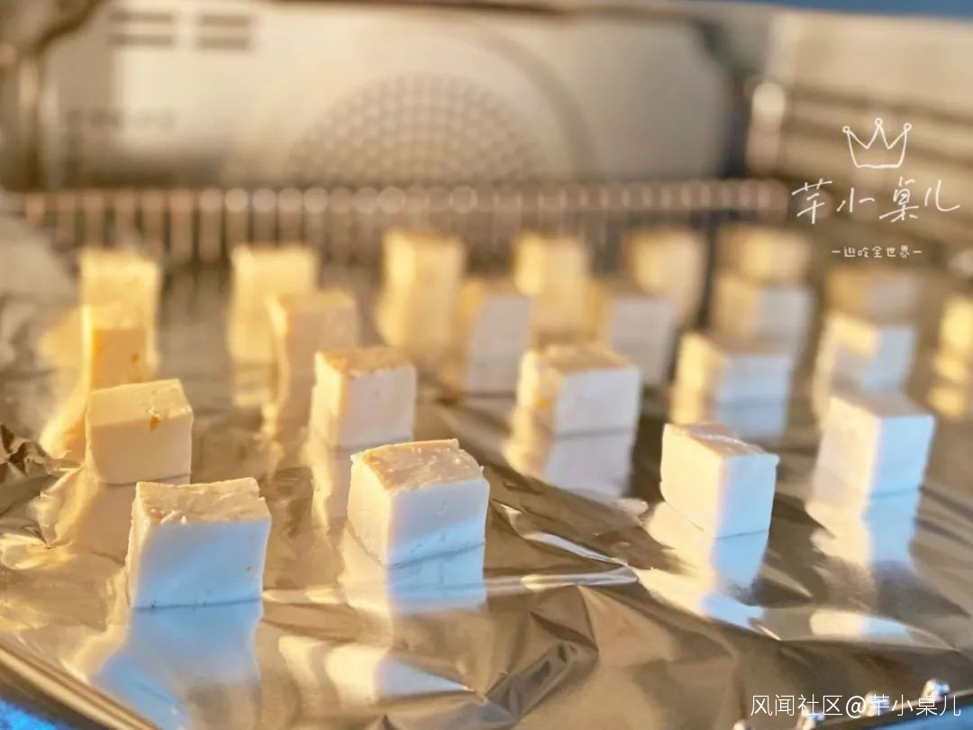 頂面側面金黃後,翻面再烤個10來分鐘,變成脆殼豆腐,你想要更香一點可以噴點油烤,但我想要儘量少吃油,所以我是幹烤的,出來成色也算金黃。