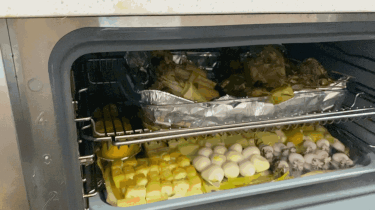期中烤的時候,因為蔬菜水分比其他食物多,所以我會放在上面,離烤管近一點。