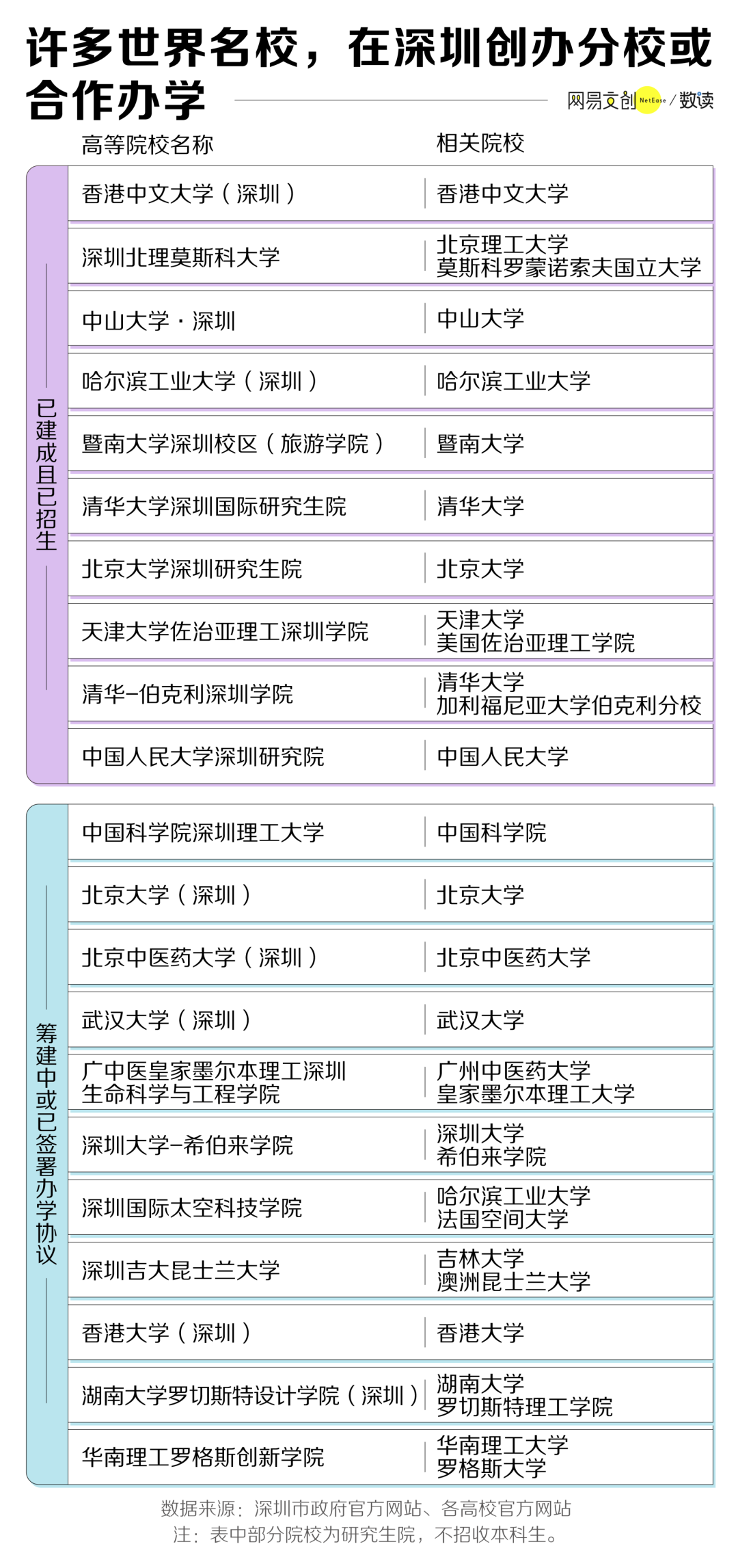 還有北京大學、武漢大學、昆士蘭大學、法國空間大學等海內外高校都傳出要在深圳辦大學的消息,雖然許多已經再無下文,但足見深圳辦校的熱度。