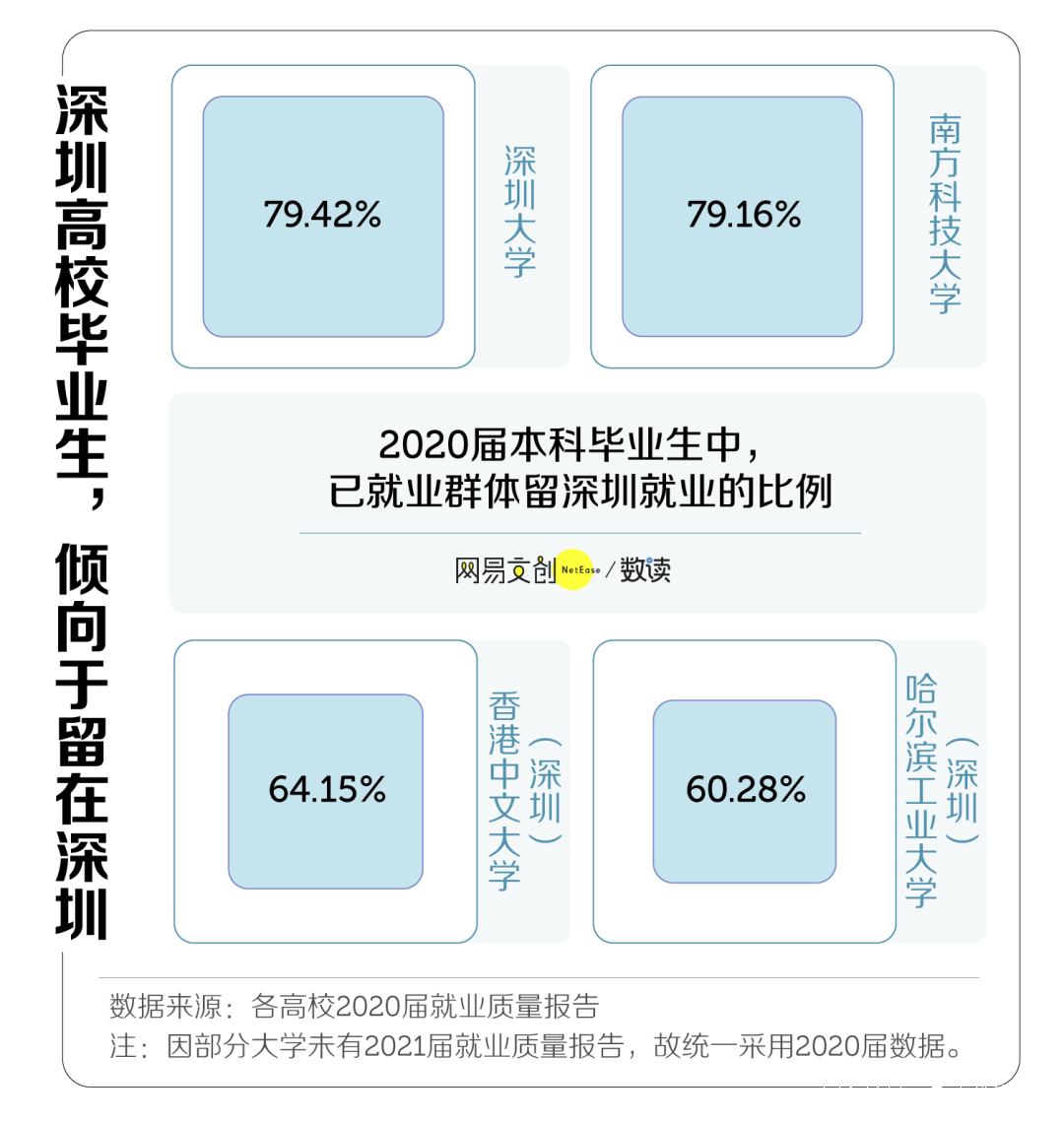 深圳大學 2021 屆本科畢業生中,已就業人羣留深圳就業率達到了 79.42%,南方科技大學也不相上下,佔比接近八成 [19][20]。