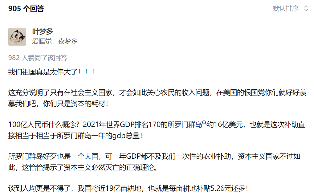 更離譜的是,高贊回答裏面有一個細節,完全是春秋筆法,就是他説這個100億補貼,給到19億畝耕地上面,每畝補貼只有5塊錢。