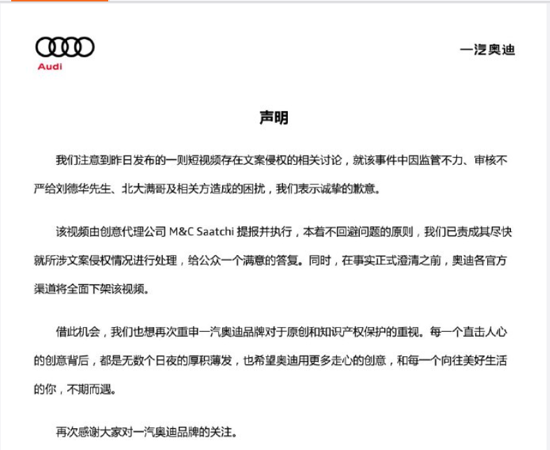 奧迪也在微博上發佈聲明,表示誠摯的歉意。同時也説,這個視頻由創意代理公司M&C Saatchi提報並執行。