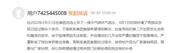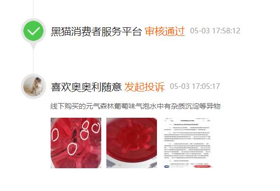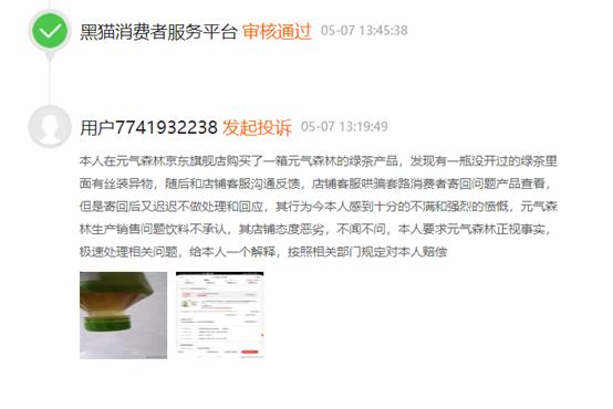 《港灣商業觀察》發現,截止2022年5月21日,在黑貓投訴上,元氣森林已經有171條投訴,已完成67條,投訴完成率偏低。其中大部分投訴內容都與食品的質量問題有關,諸如:沒開過的元氣森林青煎綠茶裏有異物;元気森林白桃味蘇打氣泡水家裏有三瓶,一瓶裏面發現疑似蟲卵的異物;產品過期等。