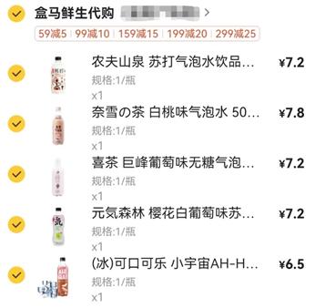 從線下經銷商定價來看,在一家盒馬鮮生代購裏所出售的幾款氣泡水裏,價格最高的為7.8元的奈雪的茶氣泡水,其次為售價7.2元的元氣森林氣泡水及農夫山泉氣泡水。