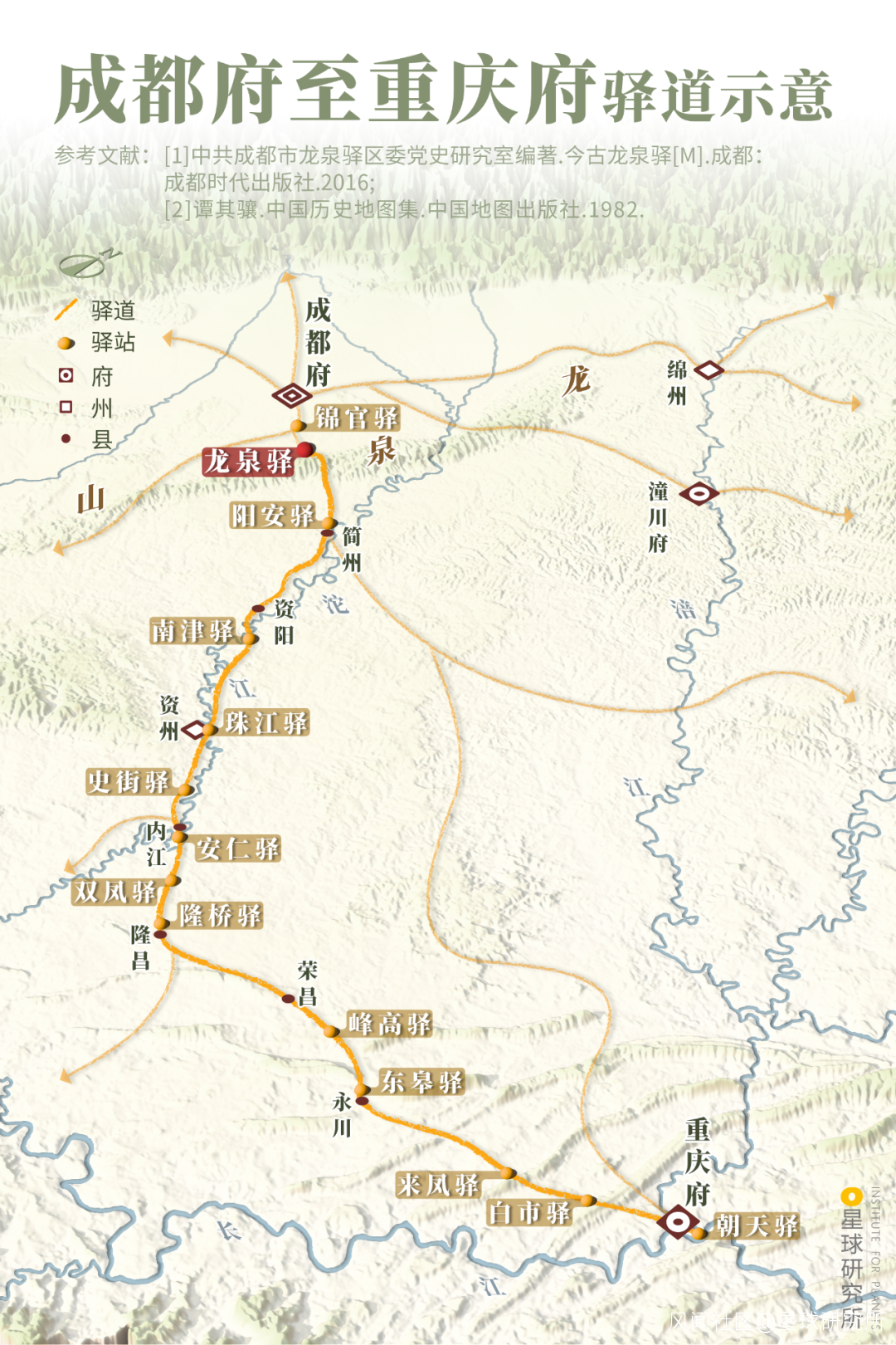 從成都出發的驛道伸展四方:向北可通陝入京,或從漢中折向江南;向西經邛、雅入藏;向南可入滇黔;而向東,就可從龍泉驛翻龍泉山至重慶,從朝天驛由水路寄舟而下,去往川東和江南。