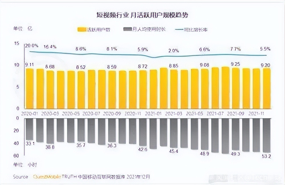 隨着新用户增長的見頂,行業進入存量競爭時代,轉為沉澱期。雖然活躍用户量增速出現放緩,但用户時長呈現加速增長態勢。根據QuestMobile公佈的數據可以看到,近兩年時間,短視頻行業的月人均使用時長增長了近20個小時。