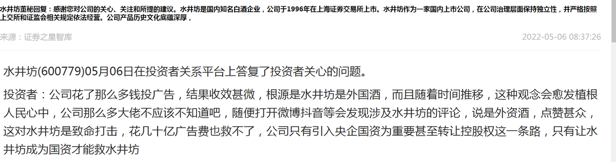 事實上,在今年5月6日,就有投資者向水井坊提問道:“公司花了那麼多錢投廣告,結果收效甚微,根源是水井坊是外國酒,而且隨着時間推移,這種觀念會愈發植根人民心中,公司那麼多大佬不應該不知道吧,隨便打開微博抖音等會發現涉及水井坊的評論,説是外資酒,點贊甚眾,這對水井坊是致命打擊,花幾十億廣告費也救不了……”