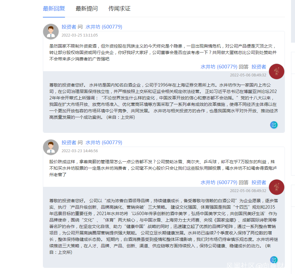 所以,在5月6日有投資者向水井坊董秘提問:“股價跌成這樣,拿着高薪的管理層怎麼一點公告都不發?公司贊助冰雪、高爾夫、乒乓球,卻不在乎7萬股東的利益,殊不知買水井坊股票的一定是水井坊消費者,公司毫不關心股價只會讓我們這些股東用腳投票,喝水井坊不如喝捨得、酒鬼、瀘州老窖了”