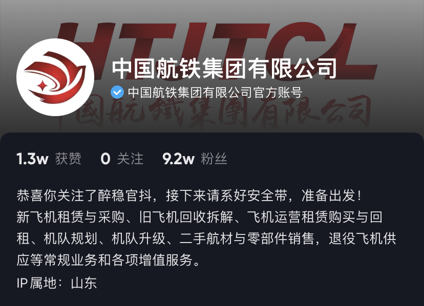 @中國航鐵集團有限公司 賬號主頁顯示,該公司主要從事新飛機租賃與採購、舊飛機回收拆解、飛機運營租賃購買與回租、機隊規劃、機隊升級、二手航材與零部件銷售,退役飛機供應等常規業務和各項增值服務。
