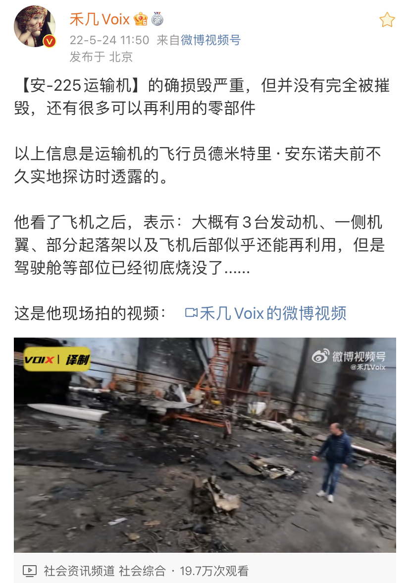 從事外交工作的大v@禾幾Voxi 今天發博説,安-225的確損毀嚴重,但並沒有完全被摧毀,還有很多可以再利用的零部件。
