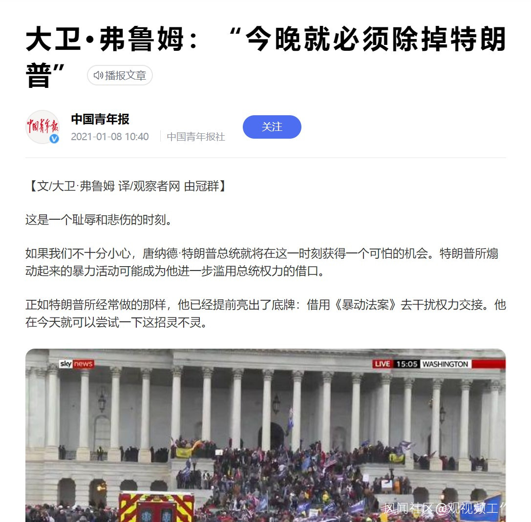 去年1月6號國會山事件爆發,大衞·弗魯姆馬上就寫文章,“今晚必須除掉懂王”: