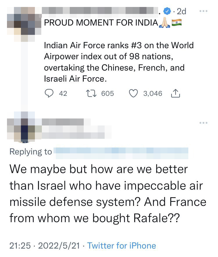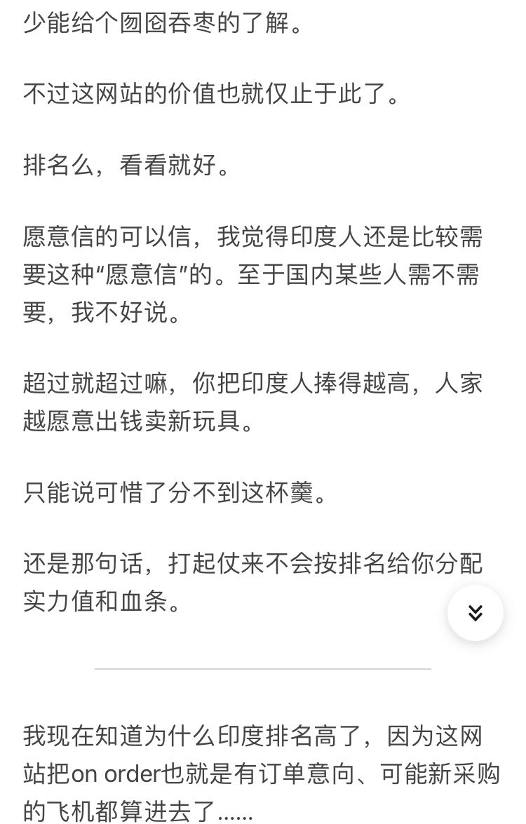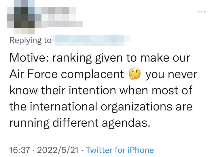 “這件事的動機:這樣的排名會使我們印度空軍驕傲自滿,你永遠都沒法知道絕大多數國際組織的意圖是什麼,這些組織都基於不同的議程。”