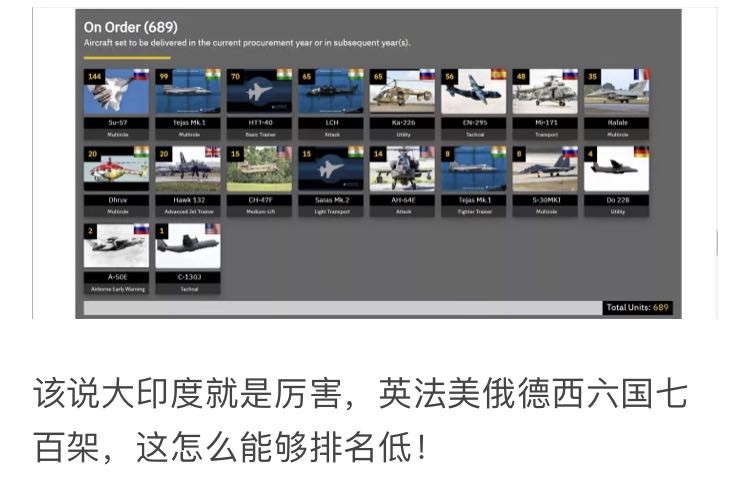 該説大印度就是厲害,英法美俄德西六國七百架,這怎麼能夠排名低!