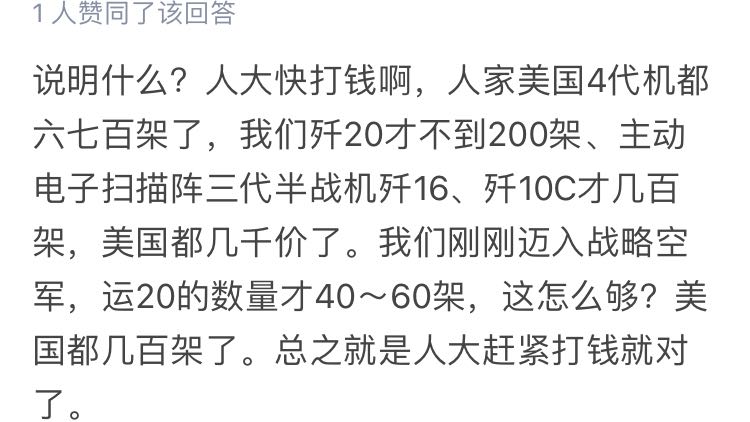 還看到有網友督促我國人大趕快打錢,增加殲20的數量: