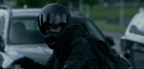 戴上頭盔,伸手合上擋風面罩,請注意,此處務必乾脆,力度太大容易顯得笨拙,力氣太小,可能就沒合上,總而言之,就是要帥氣。