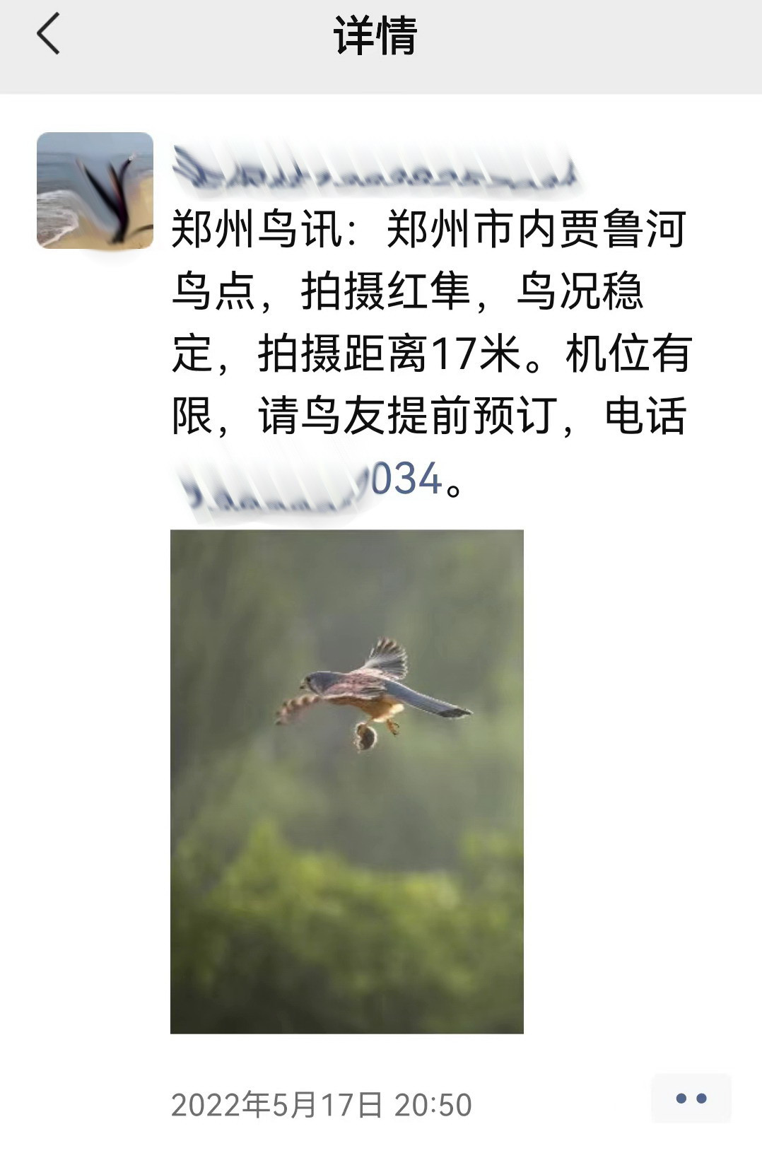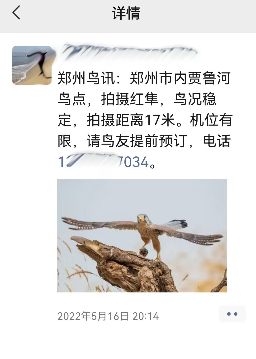2022年5月23日,筆者在鄭州市賈魯河歡河段拍攝疣鼻天鵝時,幾位不願透露姓名的鳥類攝影愛好者,告訴筆者説,2021年10月,附近個別村民在歡河段河堤(福利院旁),把活老鼠綁紮在木樁或石頭上,私自設立誘鳥拍攝收費點,誘導國家二級保護野生動物紅隼前來捕捉,通過天鵝保護等微信羣發佈拍攝信息(見截圖),吸引廣大鳥類攝影愛好者前來拍攝。