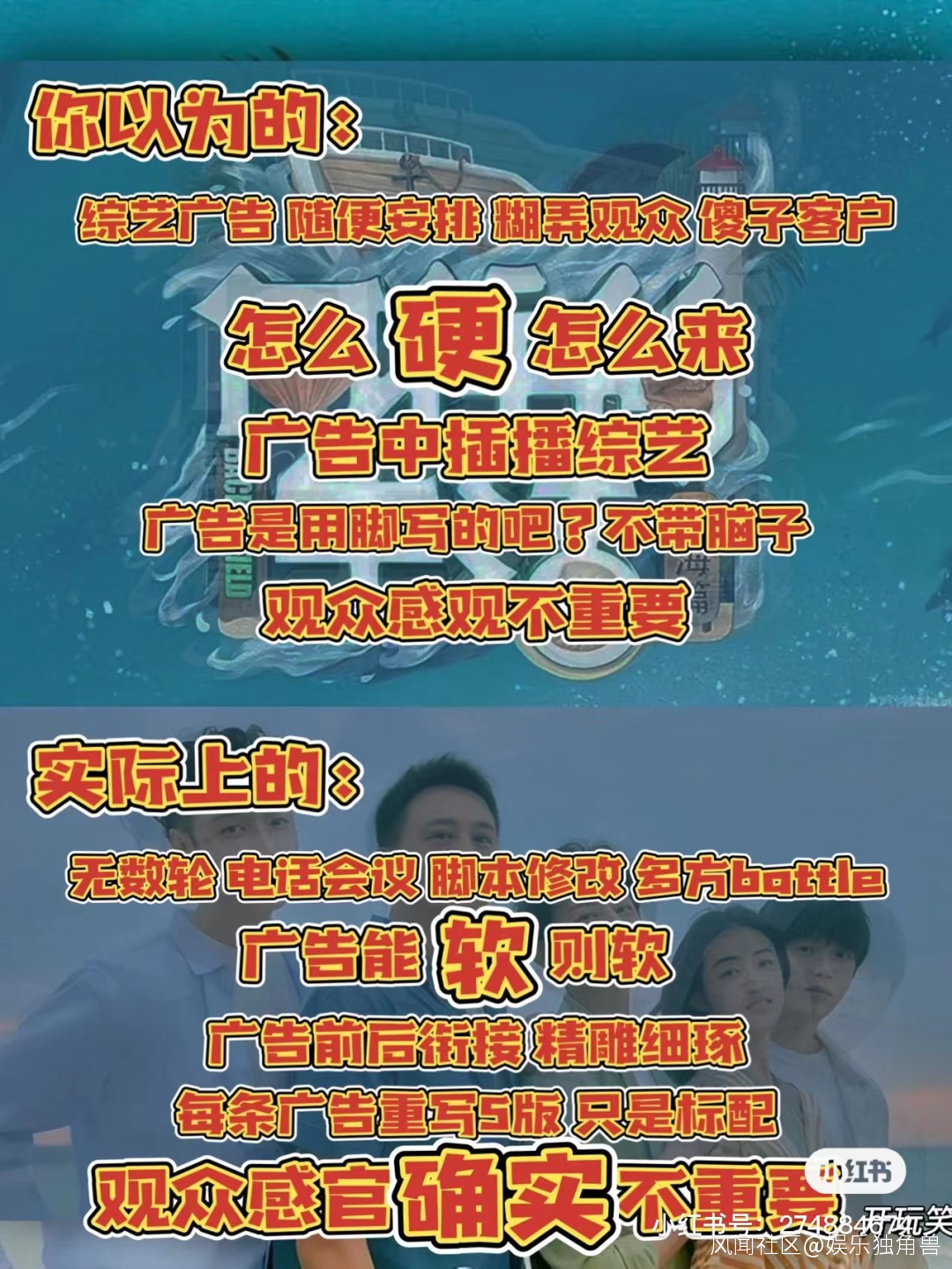 **“真實情況往往是,廣告商們天價投入、嚴格要求;廣告植入經過層層關卡‘批改’之後,與最初的樣子已然是全然不同”。**小紅書上,一位疑似業內人士的網友直言,並透露為一則植入寫出了2000字的初稿,而且“每條廣告重寫5版,只是標配”。這也真正揭開了綜藝植入的冰山一角。
