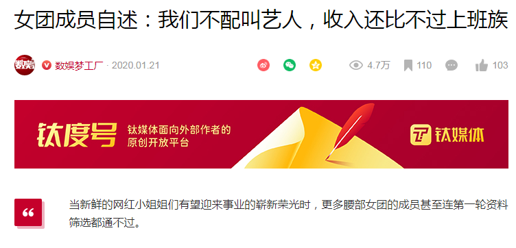 2020年有一篇相關的採訪文章,標題是《女團成員自述:我們不配叫藝人,收入還比不過上班族》。