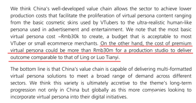 之前瑞銀的一份報告測算過,高級虛擬人物的先期投入成本平均要3000萬元,後續製作一首單曲成本200萬元,開一場全息虛擬演唱會要2000萬元。