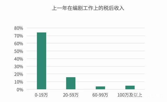 往娛樂產業鏈深處看,編劇的日子也不好過,超時工作是常態,項目夭折率高,幹活拿不到錢很正常。編劇行業甚至有一種畸形潛規則:公司騙你的稿,説明你還有價值,你最好配合。如果你沒資格被騙,就更沒資格賣掉其他的稿子。《2019-2020中國青年編劇生態調查報告》顯示,超過七成的編劇年收入在20萬以下。超過七成的人還在為了個人生計而焦慮。考慮到那些維持不了生活轉行的編劇,實際收入一定更低。