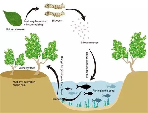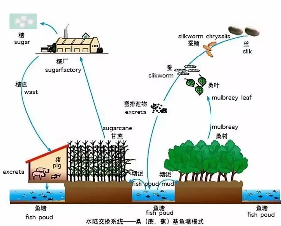 這些樹是桑樹,是用來養蠶的。兩千年來,這片地區的中國人發展出許多**高度複雜且可持續的農業生態系統。**其中最著名的當屬桑基魚塘,見下圖: